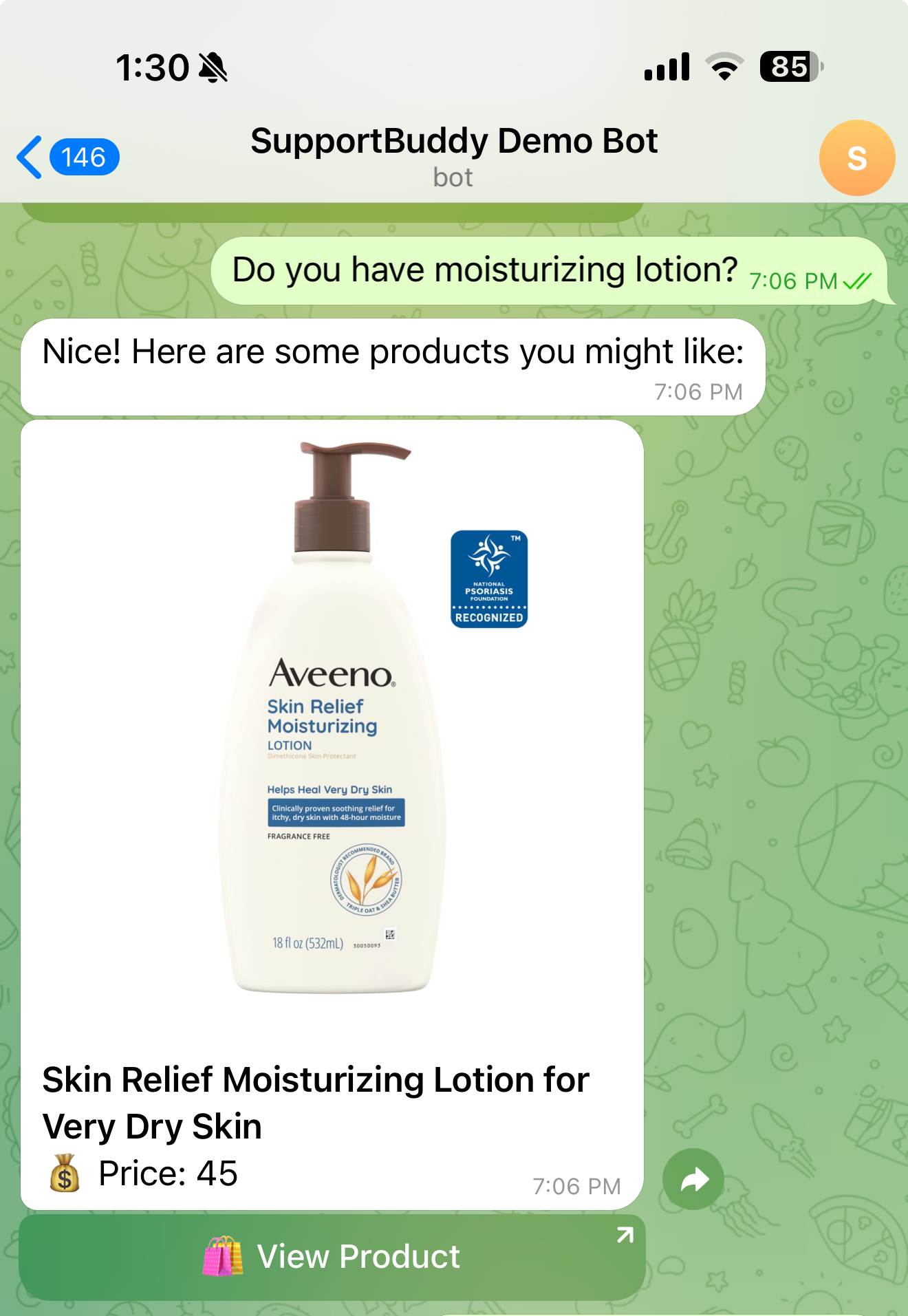 Aisk’s Telegram integration delivers the same comprehensive support as your website—answering product questions, sharing recommendations, tracking orders, and creating support tickets when needed.
